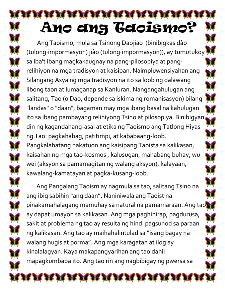 Mamuhay sa natural na pamamaraan. Pangkalahatang nakatuon ang kaisipang Taoista sa kalikasan kaisahan ng mga tao-kosmos 天人相应 kalusugan mahabang buhay w. Isulat sa bondpaper ng malinaw at maayos ang iyong sanaysay3.