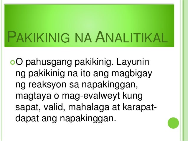 Uri ng pakikinig halimbawa pin. Ang pakikinig ay isang kakayahang katulad din ng pagsasalita na kailangan ng kasanayan upang mahusay na maisagawa. Hindi isang natural na proseso ang pakikinig.