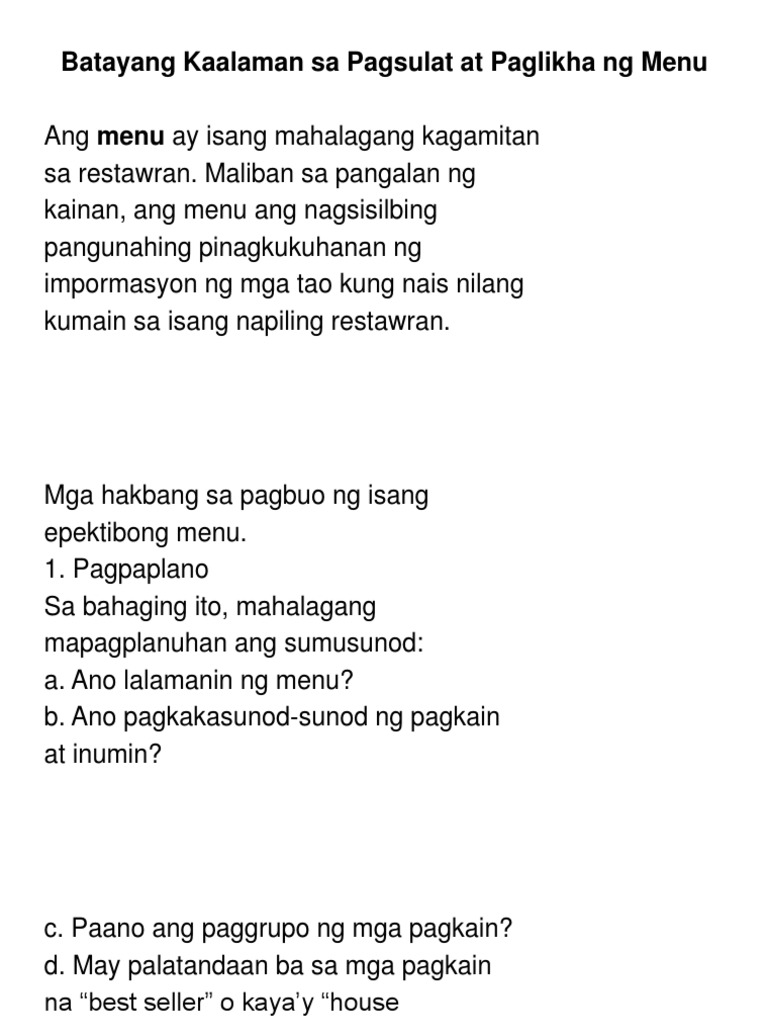 3 Gabay sa pagsulat ng Menu 1 Hitsura- Layunin nitong paglawayin ang tumitingin sa litrato upang masigurong pipiliin n tagatangkilik ang pagkain na kaniyang nakita. Ang huling bersiyon ng menu. 18-01-2017 Katangian at kalikasan ng menu ng pagkain.