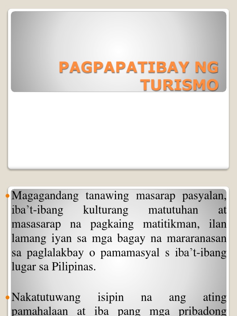 Kahalagahan ng turismo sa bansa slogan. May tatlong aspeto ang ating bansa na naaapektuhan ng pag-usbong ng turismo. NAGHAHANAP ang Department of Tourism ng bagong tourism campaign slogan na ilulunsad nito sa Miss Universe pageant sa Mall of Asia Arena sa Enero 30 2017. Gumawa tayo ng slogan.